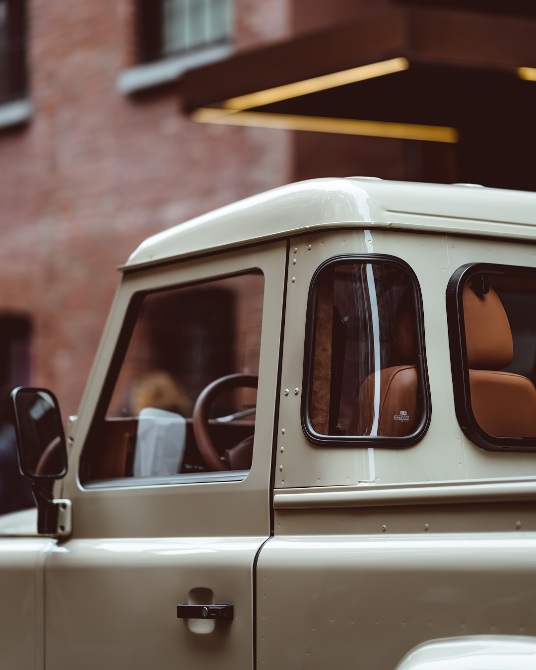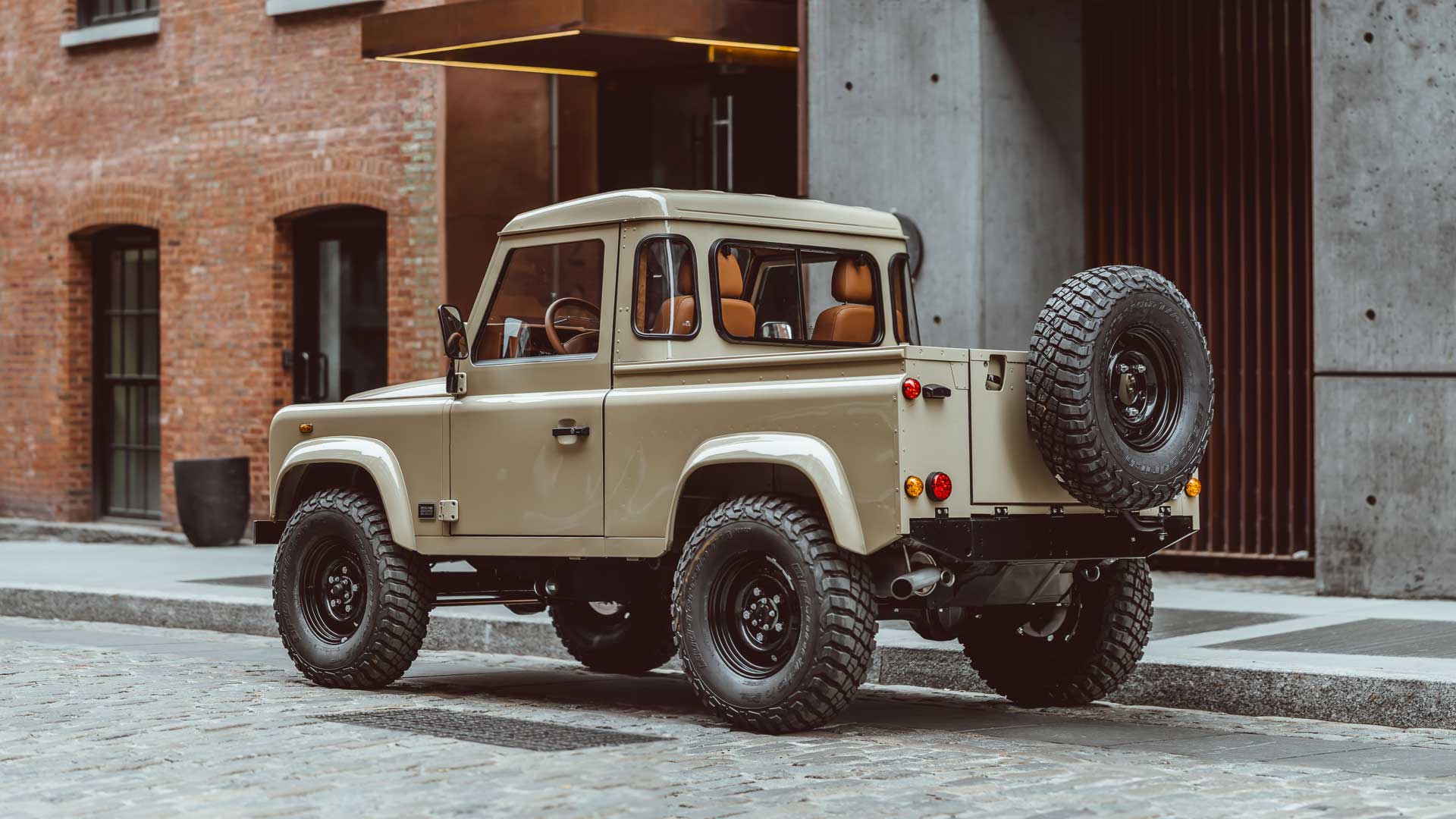 Brooklyn Coachworks Land Rover Defender 90 in Sahara Dust Pick-Up. Fitted with a restored TD5 engine and 5-speed R380 manual transmission. Dark brown chocolate leather interior, air conditioning, and 10" Sony XAV-AX6000 Touchscreen CarPlay Bluetooth stereo, Black Wolf wheels fitted with 255/85R16 (33") BFGoodrich Mud-Terrain T/A KM3 tires.