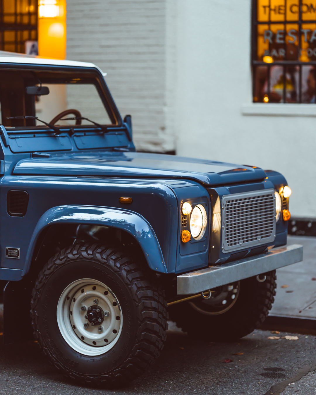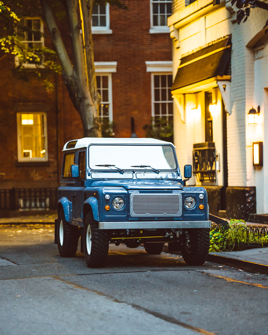 Brooklyn Coachworks Land Rover Defender 90 in Arles Blue. Fitted with a restored Td5 engine and 4-speed ZF automatic transmission. Genuine Italian Saddle Tan leather interior, air conditioning, 10" Sony XAV-AX6000 Touchscreen CarPlay Bluetooth stereo, two rear bench seats, Alpine White Wolf wheels fitted with 255/85R16 (33") BFGoodrich Mud-Terrain T/A KM3 tires.
