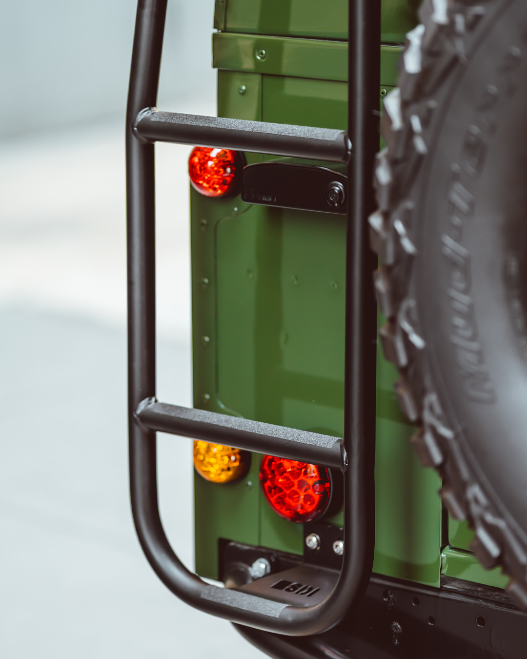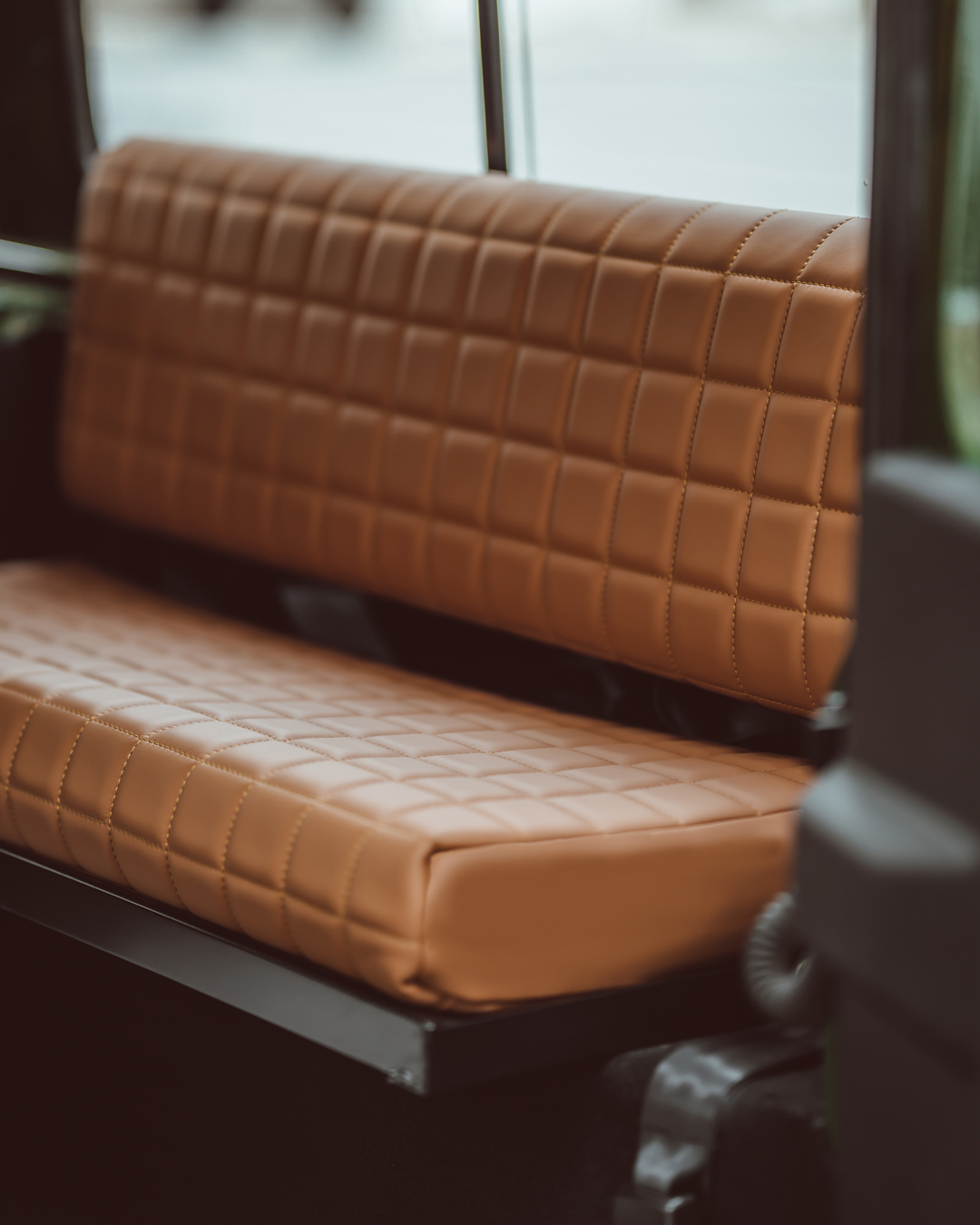 Brooklyn Coachworks Land Rover Defender 90 in Coniston Green. Fitted with a restored Td5 engine and 5-speed R380 manual transmission. Saddle tan leather interior, air conditioning, and 10" Pioneer touchscreen CarPlay stereo. Comes with Honey Beige Alcantara headliner, sunroof, Front Runner roofrack and Safety Devices ladder.